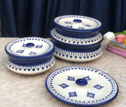 Handcrafted Blue & White Ceramic Handi Set – Floral & Heart Patterned Serving Bowls with Lids