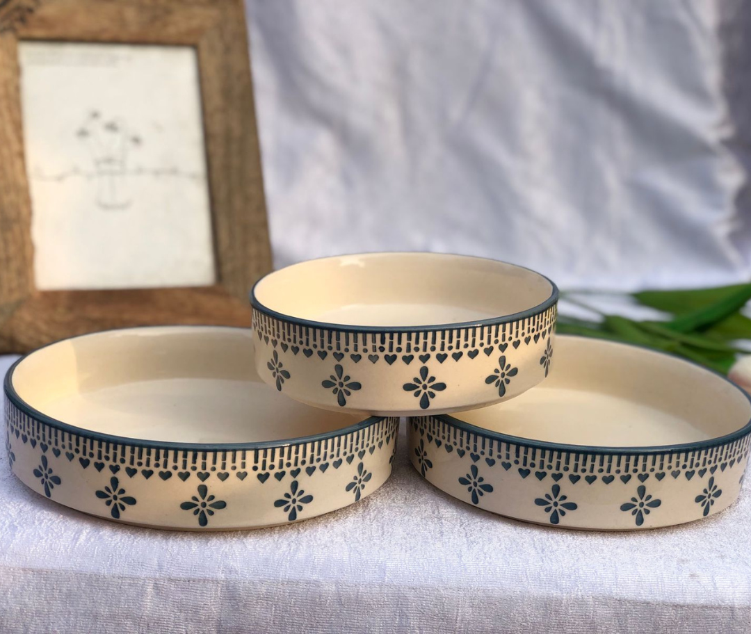 Serve in style with this elegant Handcrafted Ceramic Serving Bowl Set, designed to bring warmth and charm to your dining table. Featuring a delicate blue floral and heart pattern on a soft ivory base, these bowls reflect timeless craftsmanship with a cozy, rustic appeal.