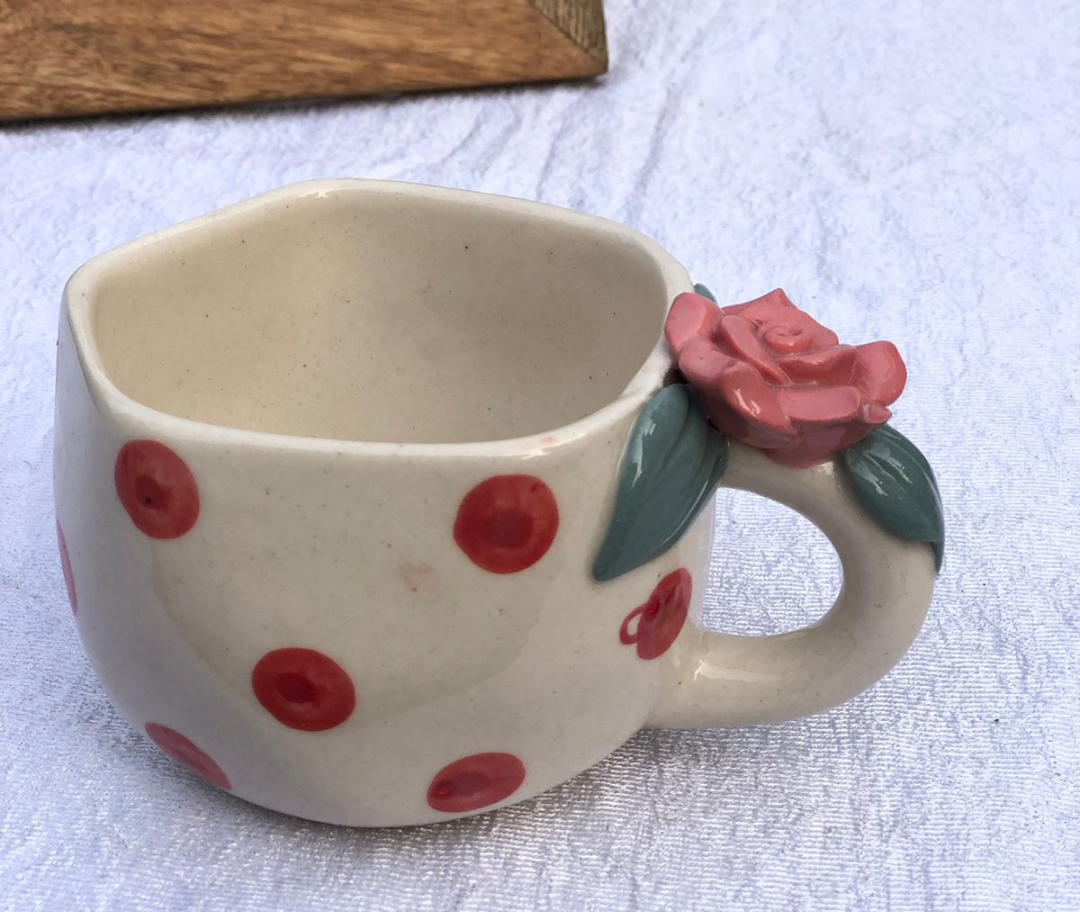 Sip in style with this charming handmade ceramic mug, beautifully detailed with hand-painted red polka dots and a sculpted rose accent on the handle. The delicate floral detail adds a romantic, artisanal touch, while the soft cream glaze keeps the look warm and timeless.