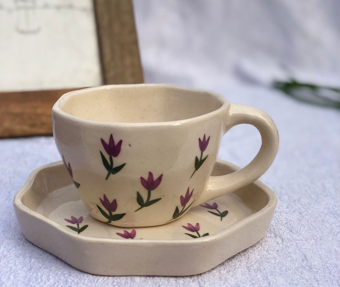 Enjoy your tea moments in timeless style with this handmade ceramic cup and saucer set. Adorned with delicate hand-painted floral motifs in soft purple hues, this set brings a calm, nature-inspired charm to your table. The smooth cream glaze and gently curved form offer both beauty and comfort in every use.